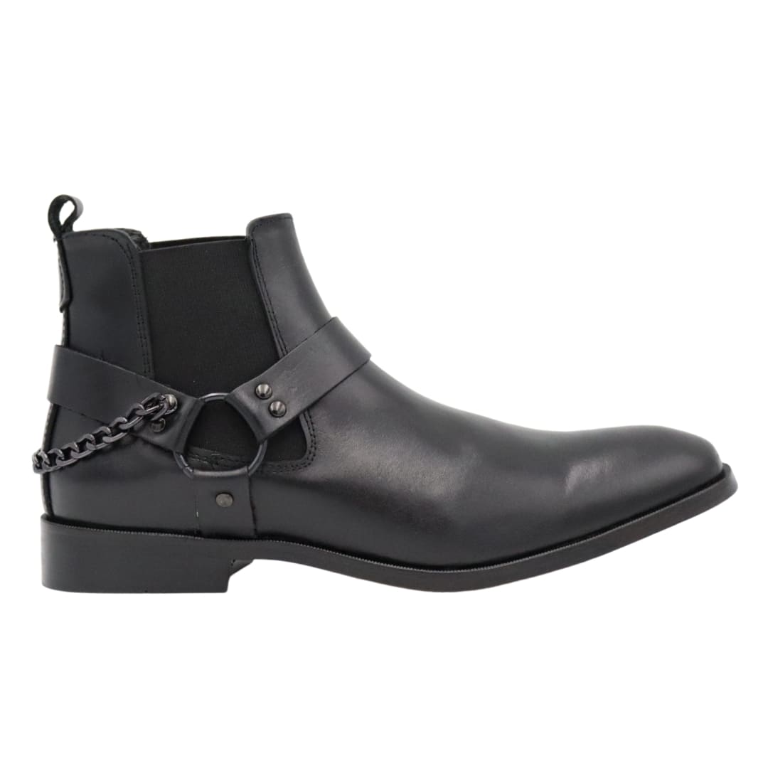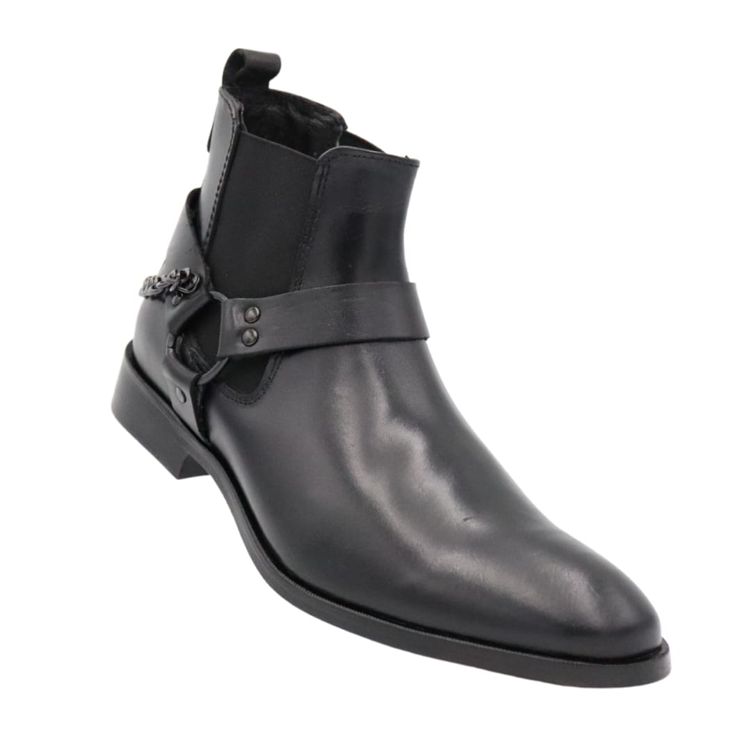 Piel Atanado Cera Negro, Forro Flor Cerdo, Suela de Cuero con Argolla y Cadena.