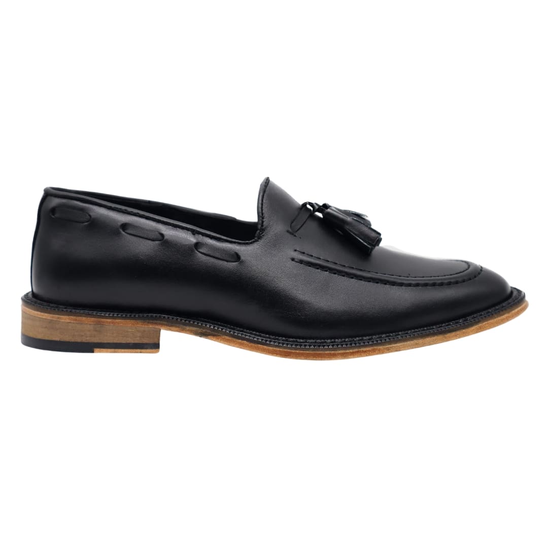Piel Atanado Negro, Forro Flor Cerdo, Suela de Cuero y Motitas.